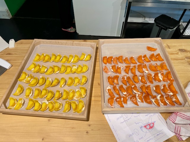 I brought the drawing to Citrus and we talked about it again. We decided on variant 2. They wanted to make it with me watching – to be sure they understood what I was looking for – so I returned on Saturday at 11 am. Here are some photos of Olga and Katerina making the ravioli-doppio. As long as I was there and it was lunchtime, I asked if they would cook them for me to test in the restaurant.